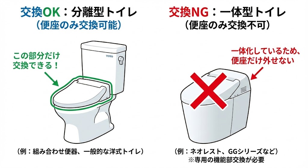- 便座のみ交換できるタイプと交換不可のタイプの見分け方がわかる