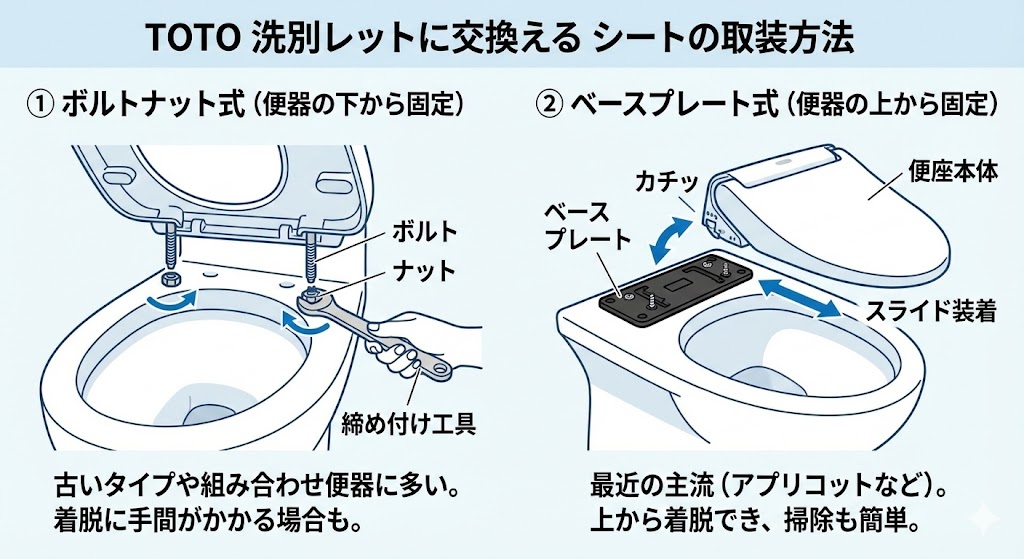 ベースプレート取り付け型は、専用のベースプレートに便座本体をカチッと差し込むタイプです。TOTOのアプリコットシリーズやSシリーズなどがこのタイプに該当します。取り外しも取り付けも簡単で、メンテナンス性に優れています。